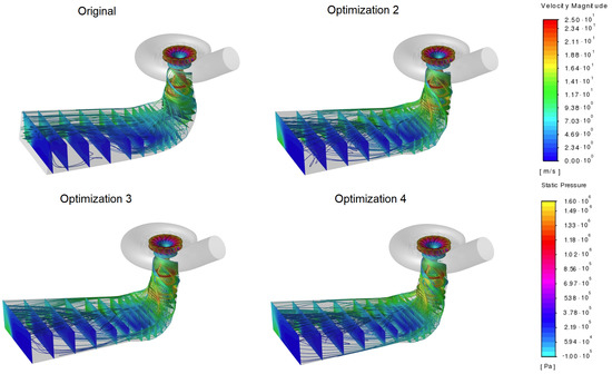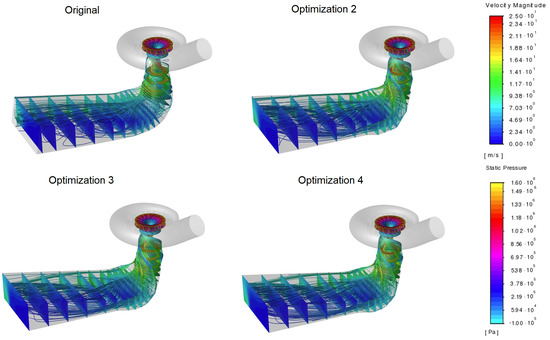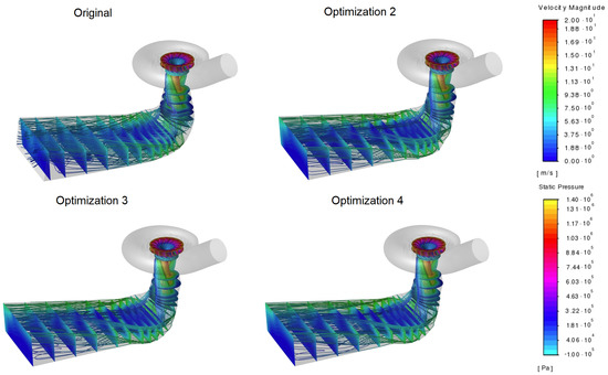 Considering that the new draft tube shape should be used under a variety of operating conditions, an additional investigation into optimal shapes was conducted for different volume flow rates. The results are given in Table 9 and shown in Figure 6 and Figure 7. A detailed visualization of the fluid flow in the draft tube for these shapes is given in Appendix C in Figure A6, Figure A7, Figure A8, Figure A9, Figure A10 and Figure A11. It is evident that under different operating conditions, the obtained shapes typically behaved worse than the original draft tube design. This indicates that a multiobjective optimization approach that integrates multiple goal functions, i.e., the maximization of the value at different flow rates, should be considered for the given problem, especially if the turbine often operates outside of the optimal operating point.