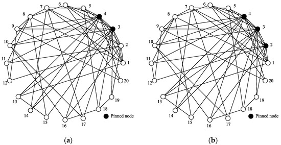 To implement the proposed algorithm, we follow the next steps. Considering the process described in Section 2.2. First, linearize the dynamics of each of the network nodes and obtain the smallest value at which each of the correspondent systems (7) become unstable; that is, where the modulus of its biggest eigenvalue is 1. We can do this by subtracting the real part of the largest eigenvalue to 1, and from there, we obtain the passivity degree . After obtaining the passivity degree for every node, we can construct matrix , and with this, we can obtain matrix (29), as defined in Section 3. By checking the number of non-negative eigenvalues of (29), we obtain the minimum number of nodes to be controlled, and we can construct the diagonal matrix that has at least values different from zero for when ; that is, when the system is being controlled. Now, that we have matrix and , we can construct matrix shown in (10) (or shown in (20) for the time-varying connections), as presented in Section 3. Then, we obtain the natural logarithm of the largest eigenvalue of (or for the time-varying connection case) for both cases, the controlled case, and the uncontrolled case. The sum of these two resulting values should be negative to achieve stability as said in both theorems of Section 3, if not, we should change the values of or select more than values.