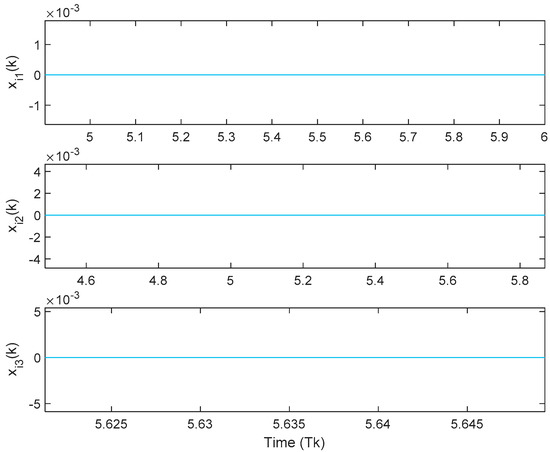 According to Proposition 1, for the invariant connections case, we obtain only one nonnegative eigenvalue for its correspondent matrix (28), but since Proposition 1 does not consider the impulsive control input, we shall try with two pinned nodes as it is harder for the network to stabilize. Analysis of the maximum eigenvalues results in a gain of for nodes , and for the rest of the nodes as these maximum eigenvalues for the controlled and uncontrolled cases are and , respectively, which means that by applying the control input every we stabilize the network for the invariant connections case.