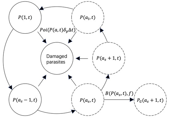 Schematic diagram showing the model compartments and transitions. represents the number of asexual parasites with age a at time t, where a denotes the developmental stage of parasites, and t denotes the time of interest, . The history and contribution of mathematical models for the population biology of malaria infection and treatment has been reviewed in [4], which provides an overview of the developmental process and need for models that account for the age a of parasites. The loop of represents the -hour life cycle of asexual parasites. During the life cycle, parasites may die and become damaged parasites, which can be modelled deterministically as in Equation (1) or stochastically by a Poisson process with a rate where is the natural death rate of parasites. Sexual commitment occurs at age where a small fraction f of the asexual parasites enter the sexual development to become sexually committed parasites . The compartments with a dashed boundary represent the stages of parasites that are sequestered to tissues and thus not measurable by blood smear.