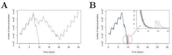 Figure 2A shows two examples of stochastic simulations: one simulation displays recrudescence after two doses of piperaquine treatment on day 7 and 12 (the red curve) while the other shows a very quick drop in parasitemia followed by extinction after one dose of piperaquine treatment on day 7 (the green curve; note that the second dose of piperaquine was not given because the volunteer did not develop recrudescence after the frist treatment). Figure 2B shows more stochastic simulations that result in extinction. In the close-up of Figure 2B, we observe that for some realization of the model, a further round of clonal expansion occurred prior to extinction occurring. This feature of the model, reflecting the synchronised population-biology of infection, contributes to a large variance in the extinction time when the number of pRBCs is small (see the circled part in Figure 2B).