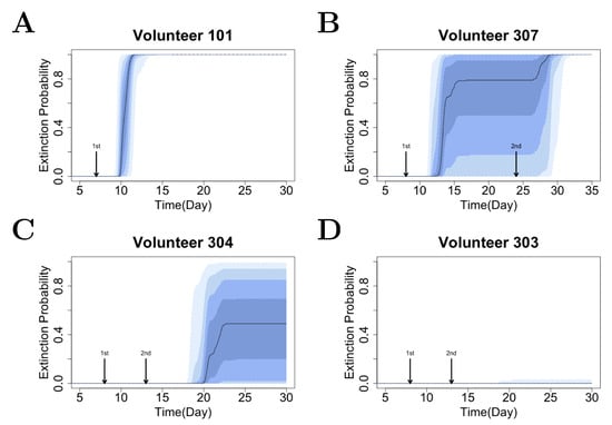 The second is the period after antimalarial treatment. In the VIS, volunteers were treated with one dose of piperaquine on day 7 or 8 and a second dose was given to those who developed recrudescence, this is, parasitemia was detected and inreased post treatment. Here we focus on examining how the extinction probability changes over time after treatment for all 17 volunteers in the VIS and identify the role of stochastic extinction in influencing the treatment outcomes. Figure 4 shows the extinction probability profiles for four volunteers which have been selected to represent the different types of behaviour observed in all 17 volunteers (results for all 17 volunteers are provided in Figure A1 in the Appendix A). In detail, Figure 4A shows the scenario in which the extinction probability jumps to approximately 100% (e.g., 2.5% of the predicted extinction probability is larger than 0.99 for Volunteer 101) after the first dose of piperaquine treatment, suggesting that residual parasites are almost certainly successfully cleared after the first treatment. Those volunteers are unlikely to experience recrudescence (a similar behaviour is seen in Volunteer 106, 202, 301 and 302; see Figure A1). There is a lag of approximately three days before the extinction probability starts increasing due to the time required for drug to reduce the number of viable parasites down to a sufficiently low level such that stochastic extinction occurs. A different behaviour is observed in Volunteer 307 where the first dose of piperaquine did not lead to a certainly high extinction probability (which is consistent with the occurrence of recrudescence). A second dose of piperaquine is required to further reduce parasitemia and in turn increase the extinction probability to approximately 100% (Figure 4B; also see Figure A1 for a similar behaviour in Volunteer 103, 105, 201, 203 and 204).