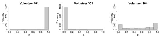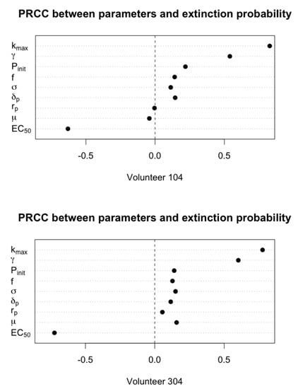 Having examined different extinction probability profiles, we look at the distribution of the extinction probability at the end of simulation time for all volunteers (see Figure A2). The distributions of extinction probability for the volunteers exhibit three different patterns (three representatives are shown in Figure 5). Fourteen volunteers’ distributions (all volunteers except Volunteer 102, 104 and 304) are concentrated at either end of the interval (indicating either a very high or very low chance of stochastic extinction) while three are distributed more evenly (e.g., Volunteer 104 in Figure 5). In order to identify the parameters determining the extinction probability using PRCC, we conduct a sensitivity analysis using the samples of the extinction probability distribution from three volunteers who belong to the third case (i.e., Volunteer 102, 104 and 304).