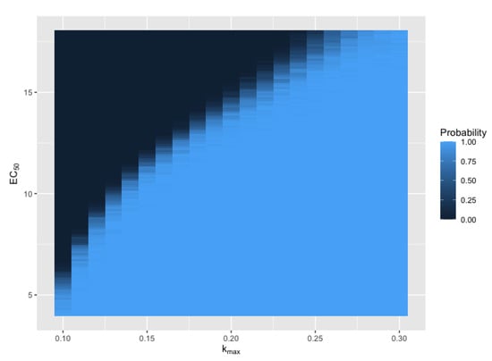 Here we focus on the effect of and on the extinction probability. Although the Hill coefficient may exhibit a stronger correlation with the extinction probability for Volunteer 102, this parameter is generally less variable than and based on earlier modelling work [8,16]. Figure 7 shows the dependence of the extinction probability on and . There is a clear transition curve that divides the extinction probability into two regions. Below the curve ( is high and is low (i.e., a strong antimalarial effect)), the extinction probability is close to 1, suggesting that stochastic extinction would be the dominant mechanism for clearing residual parasites. In the region above the curve, stochastic extinction plays little role in parasite clearance because the antimalarial drug is less effective and unable to reduce parasitemia to a sufficiently low level such that stochastic extinction is likely to occur. Only a small region of ( and ) parameter space supports intermediate values for the extinction probability.