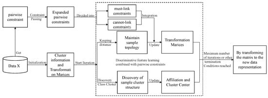 The overall process of model pcDMDS is shown in Figure 1, which shows that after obtaining some of the pairwise constraint information through data X, more constraint information is first extended by the constraint transferring algorithm. For the extended constraint information, its value is [−1, 1]. If the value is greater than 0, it indicates a must-connect constraint, while if it is less than 0, it indicates a do-not-connect constraint. And the larger the absolute value, the higher the confidence level of the constraint. After obtaining the extended pairwise constraint information, for each iteration of the model, we hope to maintain the topology of the samples on the one hand. On the other hand, we hope to find the cluster structure within the samples and make the data representations of the samples in the same cluster close to their cluster centers. Furthermore, we hope to make the data representations of the samples with the must-connect constraints close to each other and the data representations of the samples with the do-not-connect constraints far from each other through pairwise constraints. After several iterations, the model can reach a balance between these three aspects. Thus, it further improves the discriminative properties of the learned features. After the model converges or reaches the maximum number of iterations, the new data representation is obtained by transforming the matrix.