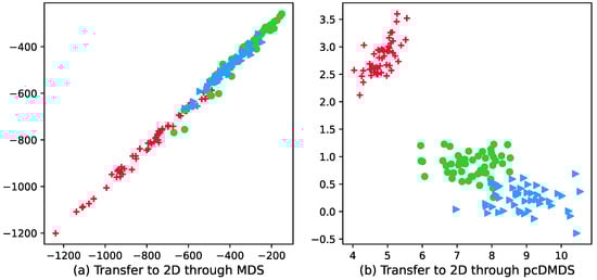 Figure 2 shows the visualization results of the wine dataset with 178 samples, 3 categories, and the number of attributes of each sample is 13. It can be seen from the visualization results in Figure 2a that the boundaries of different categories in the 2D data representation are fuzzy and unclear, that is, the discriminability between different categories has not been improved, and since the MDS method maintains the distance between samples, the samples in the same category are not more compact. In order to more intuitively show that pcDMDS can learn more discriminative features, the visualization result graph of pcDMDS is shown in Figure 2b. By comparing Figure 2a,b, it can be found that compared with MDS, pcDMDS has a more compact sample distribution in the same category in the new data representation, and the boundaries between different categories are clearer, which makes the learning features more discriminative.