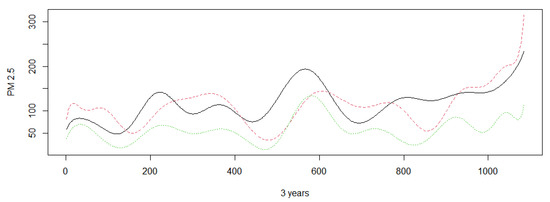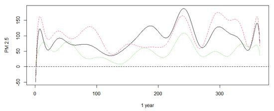 In this section, we apply our proposed hypothesis testing procedures to a real PM 2.5 dataset in Beijing, Tianjin, and Shijiazhuang between January 2017 and December 2019. The dataset was downloaded from the website http://www.tianqihoubao.com/aqi/, accessed on 10 June 2021. The data readings were taken every day, so the total data size is 1085 for every city. Beijing is surrounded by Tianjin and Shijiazhuang. Therefore, we want to know more about the average PM 2.5 difference in these three areas. The following Figure 1 and Figure 2 show the mean PM 2.5 (g/m) in Beijing, Tianjin, and Hebei Province in different time periods. There are some missing days in some cycles. Note that Figure 1 shows negative values at the beginning for a measure that is always greater than zero because of B-spline approximation.