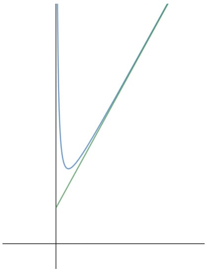 A typical graph of , along with which appears to be asymptotic to it. appears to be continuous, strictly convex and to approach as and as .