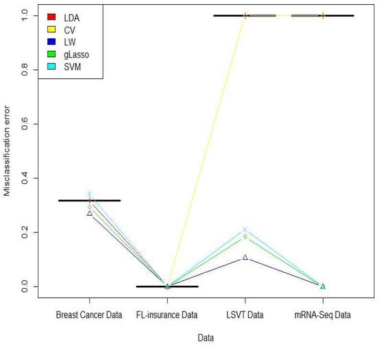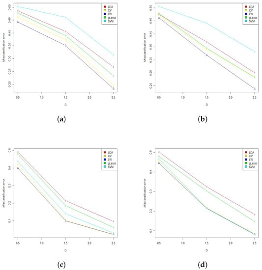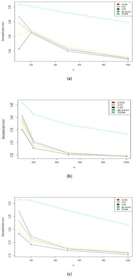 To evaluate the efficiency of the LW method, simulations were performed using values. These results are summarized in Table 3. As the dimension increased, the classical method of linear discriminant analysis as well as the proposed cross-validation method of Mkhaderi [19] could not be used due to the singularity of the covariance matrix. With an increase in the value of , the misclassification error decreased, and for each value , the shrinkage method of LW was significantly better than the other methods.