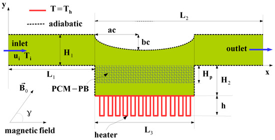 The impacts of using nanofluid and MGF on improvements in thermal performance and PC process dynamics in a channel equipped with a cavity and heater were analyzed during forced convection. A schematic view is given in Figure 1. A cavity was introduced in the channel with the distance L1 from the inlet while the heater was installed within this region. The channel, cavity and heater heights were H1 = H, H2 = H and h. The heater had N rectangular protruding elements, which occupied the length of L3 within the cavity. Above the heater, the PCM-PB region was used, which has a layer height of Hp. The PCM region contained spherical-shaped paraffin wax capsules of 20 mm diameter, while Table 1 gives the thermophysical properties. The porosity of this region was taken as 0.55. The upper part of the channel wall above the PCM region was curved with an elliptic shape. The radius in the major and minor axis were ac and bc, while the value of bc was varied during the study. At the inlet, the velocity was uniform, with a value of ui. The temperature of the fluid at the inlet was Ti, while the heater was a constant temperature, T = Th, as the HT fluid, pure water and hybrid nanofluid were used. The nanofluid contained Ag-MgO nanoparticles with SVF = . This nanofluid was used as experimental data for the thermo-physical properties (viscosity and thermal conductivity), which are available in Ref. [47]. A uniformly inclined MGF was used throughout the computational domain with an inclination of . For the nanofluid modeling, the single-phase approach is considered. Induced MGF effects and displacement currents were not considered, along with the natural convection, thermal radiation and viscous dissipation effects.