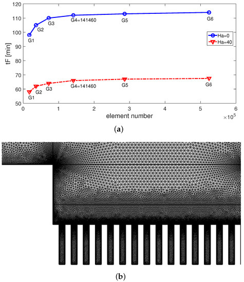Figure 2a shows the grid independence test results for phase transition time (tF) at two different MGF strengths. Grid G4 with 141,460 number of mixed (triangular+quadrilateral) elements was selected. The grid refinement locations are shown in Figure 2b. At the interfaces, near the walls of the channel and the heater, refinements were performed.