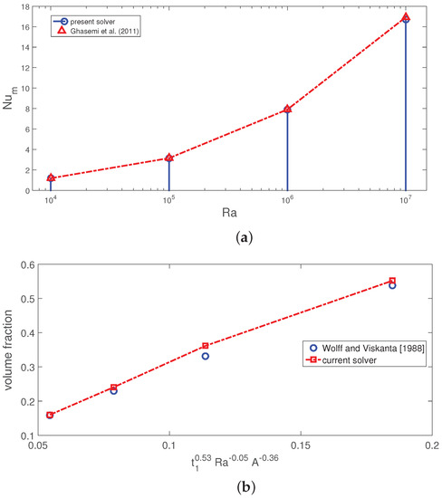 Comparison of average Nu versus Rayleigh number (Ra) for convection in a square cavity having two isothermal walls under MGF effects at Ha = 30 as in Ref. [63] (a) and comparisons of the time-dependent volume fraction as in Ref. [64] (b).