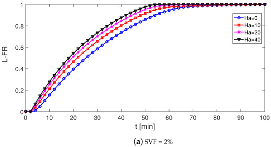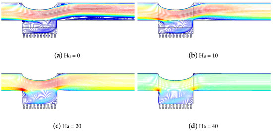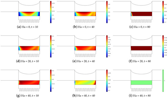 Convective HT performance and PC process in an open cavity equipped with a PCM-PB region are analyzed under MGF when multiple heaters are used. Part of the cavity above the heaters is considered as curved, while the radius of the curvature is varied between 0.01H and 0.6H. A uniform MGF throughout the domain is considered for different strengths (Hartmann number values between 0 and 40). Heaters with different heights (between h = 0.1H and h = 0.4H) and different numbers (between N = 5 and N = 17) are used, while cases with PCM and without PCM considering pure fluid and nanofluid (SVF = 2%) as HT fluid are utilized. The Reynolds number is taken as Re = 300. Figure 6 shows the MGF strength impacts on the flow pattern distributions. In the absence of MGF (Ha = 0), a large recirculation region on the bottom wall of the channel after the heaters is established. Small vortices are also formed on the corners on the curved upper part of the open cavity. As the MGF is imposed and its magnitude is increased, suppression of those regions is observed due to the Lorentz force contributions in the momentum equations. Similar observations have been reported in the literature for vented cavity and for flow over BFS [8]. The PC process is also influenced by varying the MGF strength, as the vortex distribution and its variation extending the PB region are affected with the imposed MGF. Variations in the liquid fraction (L-FR) at different time instances are shown in Figure 7 considering different MGF strengths. In the regions of PCM closer to the walls, the L-FR amount is lower, while in the middle of this zone, the amount is higher. When MGF is imposed and its strength is increased, the PC process behavior in the interior domain and near the walls are altered. This is due to the fact that with higher MGF strength, the velocity is intensified near the wall regions, and the amount of L-FR increases. At t = 80 min, a complete phase transition is observed when MGF is imposed at Ha = 40. The acceleration of phase transitions with higher MGF strength has been reported in various studies [33,34].