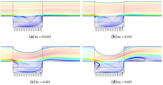 Streamline distributions by varying the upper curved wall radius (Ha = 10, h = 0.25H, N = 13, SVF = 2%).
