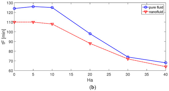 - MGF suppresses the vortices, and the velocity intensifies near the wall region. Therefore, the L-FR amount in those zones rises, and the phase-change process accelerates. The phase completion time (tF) is reduced by about and by using pure fluid (PF) and nanofluid (NF) at the highest strength of MGF as compared to cases without MGF.