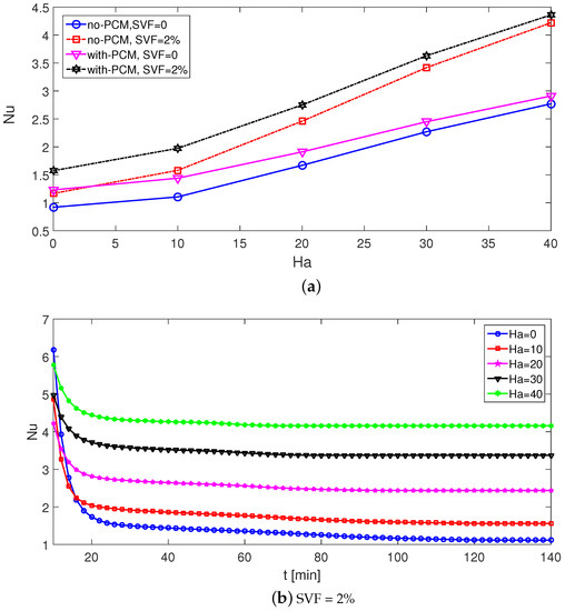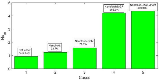 Figure 15 shows the comparison of different methods of HT enhancement by using nanofluid, MGF and PCM. As the reference case, pure fluid without MGF effects is considered, and average Nu increments are shown for different cases as compared to the reference configuration. By using nanofluid only, the spatial average Nu rises by about 33.7%, while this amount is further increased to 71.1% when PCB-PB is utilized. However, imposing MGF with the nanofluid significantly increases the average Nu up to 358.6%. When the PCM-PB system is installed for the nanofluid+MGF case, the amount becomes 373.9%. Imposing MGF with nanofluid provides the highest HT enhancement, while using PCM further improves the thermal performance, which is 37.4% in the absence of MGF (Ha = 0) and 15.3% in the presence of MGF at the highest strength (Ha = 40). Using nanofluid with MGF is effective on the thermal performance improvements and phase-change dynamics. By the combined utilization of MGF and nanoparticles, favorable impacts on the phase transition dynamics have been reported in several studies [45,46]. The reduction in the phase-change processing time depends upon the amount of nanoparticle loading, imposed MGF and other operating parameters. The wall region velocity intensification with imposed MGF will accelerate the phase-change process, while it also suppresses the vortexes within the cavity, which improves the HT. Including nano-sized particles in pure fluid improves the effectiveness of MGF and the phase-change process.
