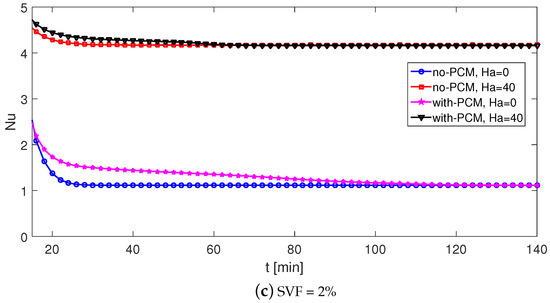 Figure 10 shows the dynamic behavior of the PC process with varying MGF strengths and complete phase transition time (tF in minutes). When MGF is imposed, the process is accelerated, while at the same time, L-FR becomes higher with higher MGF strength. This is due to the vortex suppression and intensified velocity in the near-wall regions with higher MGF strength. When NF and PF are compared, both cases show a reduction in tF with higher MGF strength, but the values are lower when NF is used. This is attributed to the higher thermal transport features by using nanofluid in the PCM-PB zone. The reductions in tF are calculated as and by using PF and NF at the highest MGF strength as compared to the case at Ha = 0. Spatial average Nu comparisons for different cases of MGF strength by using PCM-PB are shown in Figure 11a. Higher MGF cases lead to higher values of Nu, which is due to the vortex suppression and intensified wall region velocity with MGF. When cases of using PCM-PB and without PCM-PB are compared under different MGF strengths, as shown in Figure 11b, significant improvement in the average Nu is seen when PCM-PB is used. Comparison results for spatial average Nu versus MGF strength for different cases of using PCM and NF are shown in Figure 11c. As the MGF strength is increased, average Nu values are increased for all cases. The most favorable case is obtained when PCM-PB is used with NF at the highest strength, while the lowest Nu is obtained in the absence of MGF for the PF case without PCM. At Ha = 0, between the cases of using PCM-NF and without PCM-PF, the average Nu rises by about , while it becomes when MGF is imposed at Ha = 40. Including nanofluid in the base fluid when PCM-PB region is installed results in an average Nu increment of 25% at Ha = 0 and 49.8% at Ha = 40.