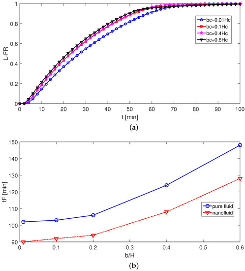 Effects of upper curved-wall radius on the time-dependent variation of L-FR (a) and phase completion time (tF) (b) (Ha = 10, h = 0.25H, N = 13, SVF = 2%).