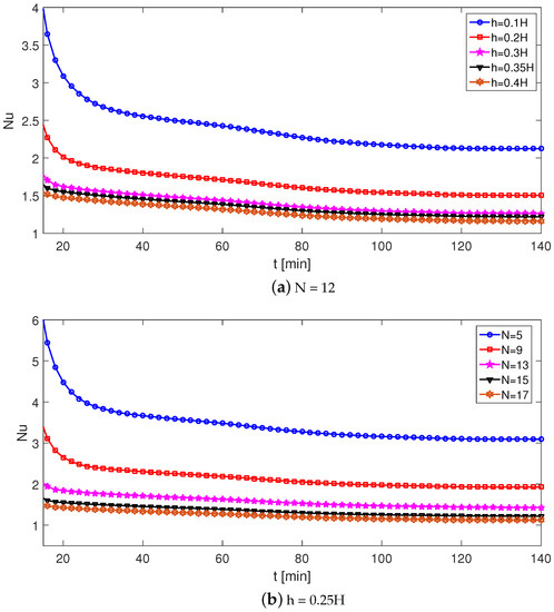 The flow dynamics and PC process are influenced by varying the curvature of the upper wall above the heater. Dynamic characteristics of L-FR for different radii of the curved wall are shown in Figure 12a. A higher value of radius (b) leads to higher L-FR until t = 70 min due to the increased fluid velocity, but after this time, the trend becomes the opposite, and the PC process becomes slower with higher radius values. This is due to the vortex formation in the PCM-PB zone with higher b values and inefficient phase transition near the wall regions, while in the interior of this zone fluid velocity rises. An efficient way to overcome this is to increase the MGF strength for the suppression of the vortex as shown before. The value of tF rises with a higher radius of the curved upper wall. The increment amounts are obtained as 45% and 42% for the PF and NF cases when the lowest and highest radius configurations are compared. The spatial average Nu rises with higher b values due to the increased fluid velocity over the heater, as shown in Figure 13. When the PCM-PB zone is installed in the system, further performance improvements can be achieved after some time. When different cases of using PCM and NF are compared, the highest average Nu is observed for the case with PCM+NF at b = 0.6H, while the lowest Nu is obtained for a flat upper wall when no PCM is used with PF. The average Nu increment becomes 83% and 47% when cases with the lowest and highest b are compared for NF+PCM and for PF without PCM. Along with the MGF, the curvature of the upper wall provides an excellent tool for HT and PC process control. The thermal performance of the heaters is shown to be influenced by using the PCM-PB region and varying MGF strength and upper wall curvature. The height and number of heaters are also influential on the thermal performance. When the height and number of heaters are increased, the spatial average Nu becomes lower (Figure 14). This can be attributed to the weak flow circulations within the narrow gaps forming the hot walls of the heater for higher height and numbers. When heater height is increased, the distance between the PCM-PB zone is reduced, while at the highest radius of the upper curved wall, the recirculation zone can be extended toward the left part of the heater, which leads to poor thermal performance characteristics.