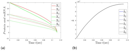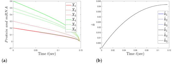 and . We take the regulatory function as and the time-varying delay is Then, from Equation (8), it can be concluded that the adaptive matrix
