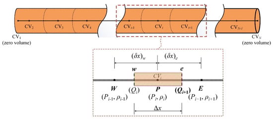 Then, Equation (5) is integrated over the space interval of each CV, resulting