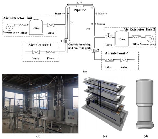 A testing PCP system was newly built in Jiangsu Shengtong Valve Co. Ltd., as shown in Figure 3. The system transports capsules between two capsule launching and receiving units (LRUs, as shown in Figure 3a) with vacuum pipelines. To transport a capsule from LRU-1 to LRU-2, the valve in the air extractor unit 2 (AEU-2) is switched on while all the other valves are switched off. The vacuum pump in AEU-2 is also turned on to extract the air out of the pipeline. Once a desired degree of vacuum has been produced, the valve in air inlet unit 1 (AIU-1) is switched on and the filtrated air rushes into the pipeline and drives the capsule to move forward to LRU-2. A series of velocity sensors were installed on the pipeline. When a capsule passes through a sensor, the transient speed of the capsule will be measured and recorded. Pressure sensors were also installed on the tanks to monitor the dynamic pressure variation during the process.