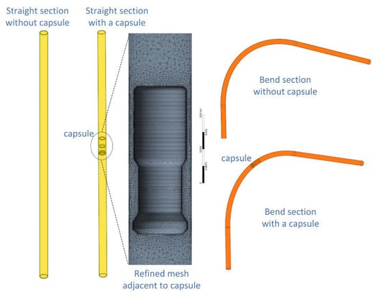 Different sections of pipelines with a unit length were modeled in 3D and then static CFD simulations were performed under various air flowrates conditions, as shown in Figure 4. The simulation was conducted on ANSYS Fluent 18.1 (Ansys Inc., Canonsburg, PA, USA) with the shear stress transport (SST) k−ω viscous model. At the inlets, the mass-flow-inlet boundary condition was used, while the pressure–outlet boundary condition was used at the outlets. Notably, the inlet flowrate is corresponding to the leakage flow rate (Ql) rather than the total flow rate (Q) in case there is a capsule in the pipe section unit. Discretization of the governing equations was based on the QUICK or second-order upwind schemes. The velocity–pressure coupling was based on the SIMPLE algorithm, and the considered convergence criterion was 10−3.