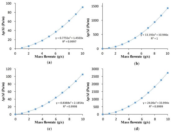 Based on Equation (2), together with a momentum equation, p and Q in a PCP could be determined. For the ease of calculation, an explicit form of momentum equation, like the Hagen-Poiseuille equation, would be preferred. However, there is no such equation available corresponding to the turbulent and compressible flow in PCPs. In this study, a simplified manner is proposed. A series of 3D CFD simulations with regard to typical kinds of pipeline segments (straight/bend and with/without capsules) is proposed to be performed in advance, and then model order reduction based on data fitting can be performed to obtain the desired explicit form equation. It has been found that second-order polynomials shown below can be used with favorable goodness of fit.