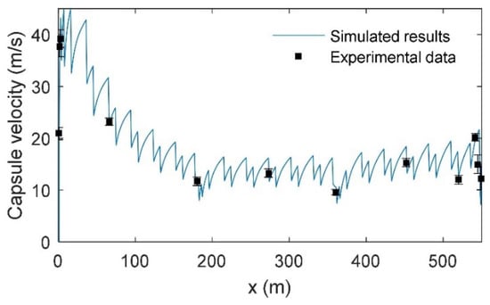 Capsule velocity results are presented in Figure 6. According to numerical simulation, the capsule is accelerated rapidly at the initial stage, and the transient speed increases by 40 m/s within a short distance (less than 3 m). Then the capsule is generally slowed down to a velocity of around 15 m/s. During the whole process, there are a series of velocity losses when the capsule is passing through the bend or vertical sections of the pipe, and also a series of subsequent procedures of velocity recovery in the following straight and horizontal sections. The simulated velocity profile was compared with the experimentally measured results to validate the model as well as the numerical method. As shown in Figure 6, the simulated and experimental results agree very well. The simulated OCT (35.12 s) is also very close to the experimental result (35.26 ± 0.92 s)