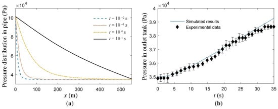 The dynamic pressure distribution in the system was also predicted by simulation and presented in Figure 8. As soon as the process is initiated, the inlet pressure step into the atmosphere. Consequently, the pressure near the inlet increases rapidly while in the rest sections the pressure maintains at the initial level. As air flows forwards to the outlet, the overall pressure distribution evolves from a sharp profile at first to a linear profile generally, as shown in Figure 8a. The simulated dynamic pressure at the outlet (tank pressure) is compared with the experimentally measured results, which demonstrates high agreement again as shown in Figure 8b.