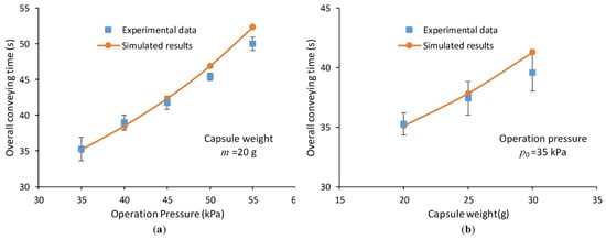 Experimental and simulated overall conveying time with various operation pressure (a) and capsule weight (b).