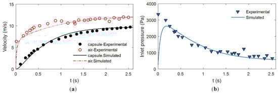Comparison of simulated results with literature data: (a) capsule velocity and air velocity behind the start point of the capsule; (b) air pressure at the flow inlet.
