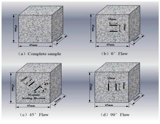 By virture of its isotropy in mechanics and homogeneous in texture, the test material is granite with relatively good integrity and uniformity, as shown in Figure 1 (made by author). In order to ensure the accuracy of experimental results, all test specimens were manufactured according to the International Society for Mechanics and Rock Engineering [40]. First, intact rocks were cut with a nominal size of 45 × 45 × 20 mm3. Then, diamond saw is used to cut the flaws with different diffsrsnt inclina-tion angles α (the angle is between horizontal direction and flaw orientation as shown in Figure 1), which were divided into 0°, 45°, 90°. Finally, we polished the parallel-flawed rocks until the surfance roughness was less than 0.02 mm, the depth of the cracks is about 1 mm, the crack length is 10 mm and the width is 1 mm. The average density of the rock samples is 2580 kg/m3, the average elastic modulus is about 9.86 GPa. Before dynamic loading test, it is essential to use the INSTRO 1346 test system to conduct uniaxial compression test on rock specimens. Three specimens are tested for the specimen configuration and the average com-pressive strength is 139.66 MPa. This experiment included two kinds of specimens: intact specimens and pre-flawed specimens with different angles, a total of 66 samples were required. Among them, there were 6 intact specimens and 18 samples for other 3 kinds of crack angles.