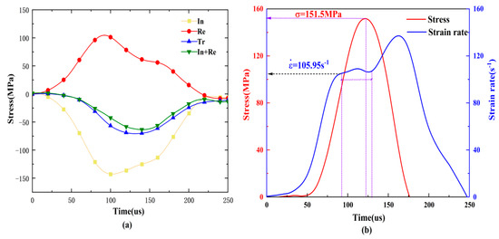 Dynamic stress equilibrium curves of specimjen and determination of strain rate: (a) stress equilibrium curves of specimen S0-flaw0°-2 and (b) the evolution curves of the strain rate and stress of S0-flaw0°-2.