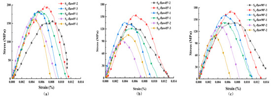 Stress-strain curves of specimens with an artificial flaw under coupled static and dynamic loads: (a) 0°flaw; (b) 45°flaw; (c) 90°flaw.