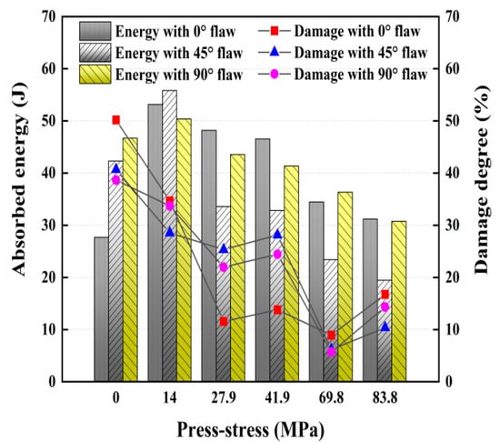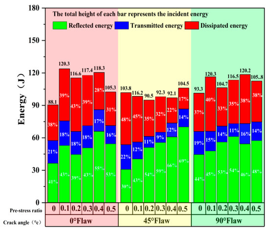Using Equations (4)–(7), the energy partitions of the confined double-flawed specimens under different axial pressure conditions are determined. Figure 6 presents the incident energy of confined double-flawed specimens under different axial pressure in each crack angle group. The abscissa at the bar grasp bottom represents different crack angle groups, and the axial pressure increases successively from left to right in each crack angle group. Under the same incident energy and impact velocity, the axial pressure makes rocks deform more difficulty. As the axial pressure increases, specimen require more incident energy to obtain a similar strain rate. The reflected energy, transmitted energy, and dissipated energy are normalized by the incident energy, which are shown in Figure in the form of a percentage. As the axial pressure increased, the proportion of reflected energy decreases gradually, which changes from 55% to 44%, and the transmitted energy decreases from 21% to 14%, while the dissipated energy first increases and then decreases, the maximum value is reached when the axial pressure is 0.1 MPa. The higher axial pressure improves the bearing capacity of the specimen, and more energy is used to fracture the rock. When the axial pressure is small, the micro-cracks inside the rock are closed, the dynamic strength increases, and the energy used to destroy the rock will increase. As the axial pressure continues to increase, the micro-cracks inside the sample grow and expand, the energy storage inside the rock gradually increases, and the energy required for rock failure also decreases. Therefore, the proportion of transmitted energy is negatively correlated with the axial static pressure. Under a similar axial pressure, the proportion of reflected energy first decreases and then increases with the increasing of crack angle, while the proportion of transmitted energy and absorbed energy increases first and then decreases, which indicates that there is no obvious relationship between crack angle and energy utilization efficiency of rock under combined dynamic and static loading.