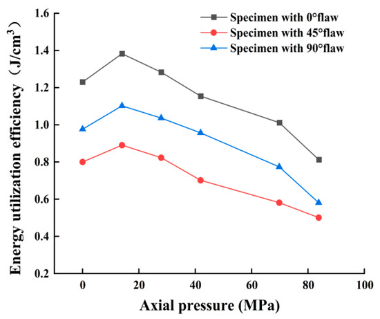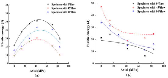 As shown in Figure 11a, the elastic energy stored by the rock under the combined dynamic and static loading is generated by the axial pressure and the impact load. When the impact load is constant, the elastic energy stored in the rock first increases and then decreases with the increasing of the axial pressure, this is because the impact loading time is very short and the rock sample instantly completes the two stages of energy storage and energy release. When the axial pressure reaches a certain value, the damage of the rock sample increases sharply, and the internal micro-cracks develop rapidly. The damage degree of the rock sample is small in the initial stage of the impact, and the ability to resist the impact load is not obviously, resulting in elastic energy of the rock sample increases rapidly, it indicates that the rock sample has a tendency to transform from brittleness to ductility. When the axial pressure is more than 41.9 MPa, the elastic energy decreases with the increasing of the axial pressure, it proves that the high axial pressure aggravates the internal damage, reduces its strength, and weakens the ability of energy storage. In addition to the change of elastic energy, the rock often has a change of plastic energy during dynamic and static combined loading. As shown in Figure 11b, the plasticity energy generally decreases with the increasing of the axial pressure, it is indicated that irreversible structural changes have occurred inside the rock sample when the rock sample is irreversibly deformed under impact loading, and studying the change law of plastic energy can reveal the evolution characteristics of the internal structure of sample. When the axial pressure is relatively low, the original cracks or formed due to the pre-axial pressure are not fully closed, and they continue to close and consume more energy under impact loading. The crack of rock closes more sufficient with an increasing of the axial pressure, and the energy consumed for micro-crack closing is correspondingly reduced. The new cracks caused by the impact load continue to expand and the energy consumed at this time increases slightly with an increasing of axial pressure.