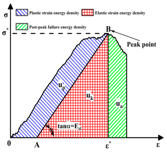 According to the law of thermodynamics, the elastic energy density uk and plastic energy density up can be obtained according to the dynamic stress-strain curve. In the following equations, * is the dynamic peak stress, * is the dynamic peak strain, Ed is the dynamic elastic modulus, EK and EP are the elastic energy and plastic energy in the loading process, as shown in Figure 10.