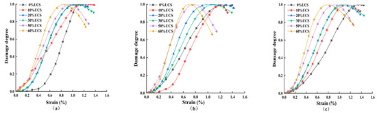 Damage degree under different strain of: (a) 0° flaw; (b) 45° flaw; (c) 90° flaw.