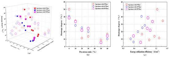 The damage variable is an important index to define the damage of rock with the change of energy during the loading process. In this paper, we define a new damage degree form, that is, the ratio of the energy absorption density to the maximum energy absorption density of the rock during the combined dynamic and static loading process. We find that the newly defined damage variable exhibits an obvious nonlinear relationship with the axial strain, and the damage degree increases with the increasing of the axial strain. Figure 17 shows the coupled effects of axial pressure and energy absorption density on rock damage. As shown in Figure 16b, for a certain crack angle, with the increasing of axial pressure, the rock damage degree shows an obvious decreasing trend, which verifies that the axial pressure has a certain inhibitory effect on the final rock damage degree. Figure 16c shows that the damage degree increases with the increasing of energy absorption density, which indicates that the energy absorbed under impact loading is further converted into elastic strain energy required for rock failure.
