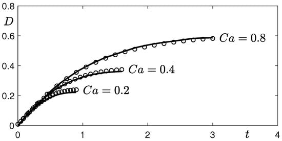 Figure 3 shows the evolution of the droplet deformation parameter D. The solid lines and symbols are results from [32], and the current phase-field method, respectively. Here, , are used. The capillary number is defined as . The numerical results from the two different computational methods are in good agreement with each other.