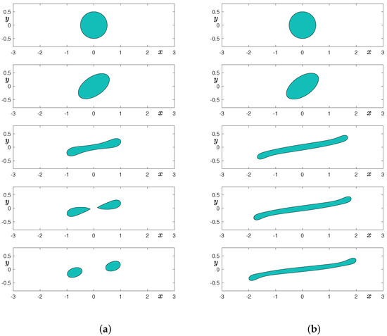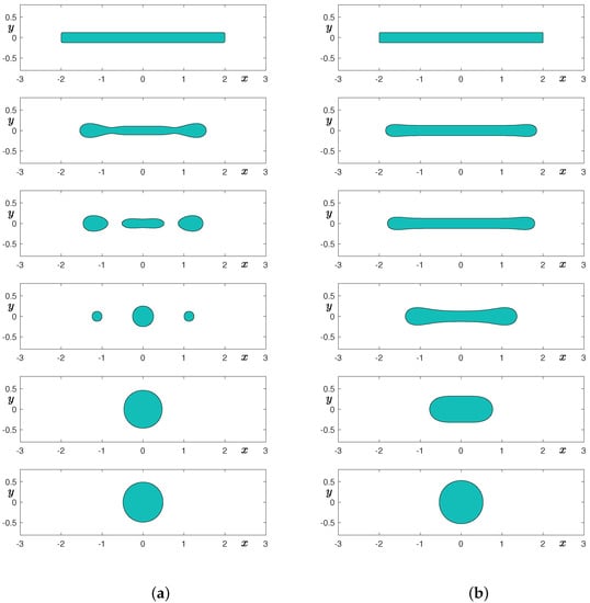 Figure 8a,b show the temporal evolution of a thin rectangular shape without fluid flow with and grids, respectively. It is well known that the dynamics of the Cahn–Hilliard equation do not preserve the convexity [34]. As shown in the second row of Figure 8, the shapes are not convex, even though they are initially convex. In the case of the coarse grid, we can observe that the initially thin rectangular shape undergoes a smoothing stage at the sharp corners and breakups into three smaller droplets. Furthermore, the largest droplet absorbs the smaller ones and results in a single drop. In the case of the finer grid, we can observe that the initially thin rectangular shape undergoes shape transformation into a droplet without topological change. Therefore, the breakup of an elongated shape in 2D is mainly due to insufficient grid resolution. We note that we may avoid this breakup phenomenon in 2D space if we use a conservative Alllen–Cahn equation that models the motion by mean curvature under mass conservation constraint [35].