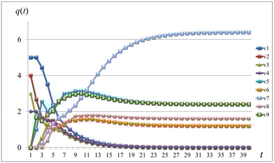 The resource distribution over time for the network represented by matrix (21). , and the vector of the initial state is . The resource values in vertices (–) tend to 0; all the resource is concentrated in vertices (–).