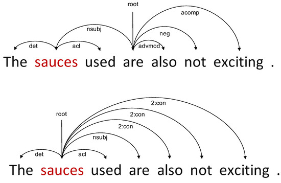 Inspired by the methods reported by [8,11], a Triplet Contrastive Learning Network (TCL) for ALSC is proposed to address the aforementioned issues. For the exploiting of syntactic information, we start with reconstructing the syntax dependency tree by setting the aspect as the root according to [12] (Figure 2). The dependencies between aspect word and other words are explicitly established, which contributes to the capturing of opinions words to the aspect and restricting the introduction of redundant information. As presented in [13], the key phrase plays a pivot role in delivering the essence of texts. To further filter the noise and highlight the key information, a contrastive learning scheme is proposed to magnify the significance of sentiment-related words. In ALSC tasks, the key phrases are either nouns, verbs, adjectives, or adverbs of degree [14]. With the application of masking mechanism, both positive and negative examples are generated and fed into the contrastive learning module to enhance the impacts of key phrases and distill the syntactic features.