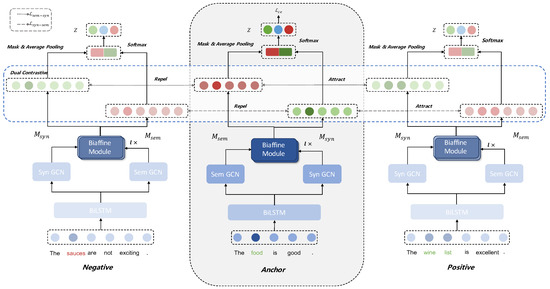 In the proposed model, the main purpose of the dual contrastive learning is to comprehensively align the features of both syntactic space and semantic space. The global syntactic features and semantic features can thus be captured. Notably, the output of the biaffine unit (i.e., and are taken as the input of the dual contrastive learning module. For each input , the sequence with the same sentiment polarity within the same batch is considered as the positive example , otherwise as negative example . The loss function of the dual contrastive learning is presented as: