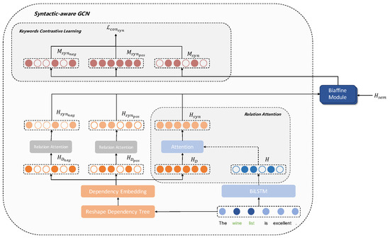 The architecture of syntactic-aware module is exhibited in Figure 4. As pointed out in the Introduction, the syntactic-aware GCN in our model tends to precisely capture the aspect-related context words and remove the redundant information. According to [12], a relational graph attention network is devised. Specifically, we construct an aspect-oriented dependency tree to replace the adjacency matrix of classical syntax dependency tree. Then, the attention mechanism is applied to the reshape sub-tree to capture the aspect-specific contextual features. Moreover, to resolve the long-dependencies among words, we set four categories of words as the key phrases that contributes to sentiment delivery, i.e., nouns, verbs, adjectives, and adverbs of degree. As such, the contrastive learning is performed to enhance the features of key phrases and effectively capture the word feature of long dependency.