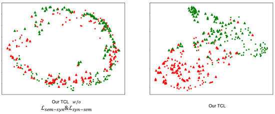 The distribution of semantic and syntactic representations aims to verify the effectiveness of the dual contrastive learning scheme. Figure 6 shows the visualization of semantic and syntactic outputs of the dual contrastive learning module using t-SNE algorithm [34]. To facilitate the comparison, we only take the data with positive and negative sentiment polarities for visualization. Apparently, both the basic TCL network and TCL without dual contrastive learning can distinguish one type of representations. Notably, the proposed model without dual contrastive learning fails to resolve the two types of vectors with the same sentiment polarity, such as the distribution of red dots, which indicates the importance of alignment between the semantic and syntactic spaces. Moreover, there are large amount of overlapping for vectors with different sentiment polarities. The uniformity of syntax and semantics is absent. In comparison, the TCL network considers both the alignment and the uniformity of features. With the application of dual contrastive learning scheme, not only the distribution of the same-polarity-representations is more concentrated, but also the overlapping within different-polarities-representations are reduced to a large extent.