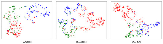 Similarly, the visualization of triplet contrastive learning is also performed; see Figure 7. For the ASGCN that merely exploits the syntactic features, the neural samples can be distinguished from those of other two sentiment polarities. Whereas, the classification between positive and negative samples is challenging, with large amount of misunderstanding of the sentiment. Since DualGCN tackles both syntactic and semantic information, the samples of three sentiment polarities can be better discriminated. The distribution of neural samples is still not that distinctive, especially comparing with the negative samples. By contrast, our model shows its dominance in sentiment classification. It is clearly that a more concentrated distribution of samples with the same sentiment is accessible. Due to the introduction of triple contrastive learning, a better performance of feature learning and sentiment classification can be expected.