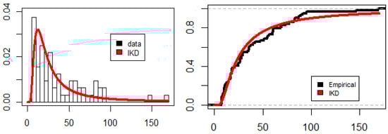 Using the Kolmogorov-Smirnov (K–S) test, the data set is checked for such a fitted model and the estimates are obtained using the ML method. With a p-value (PV) of 0.591, the K–S distance is 0.409. As a result, it is obvious that the IKD is a suitable model for fitting these data. Data’s estimated PDF and CDF are displayed in Figure 10. According to this graph, the IKD seems to be a suitable model for fitting the data.