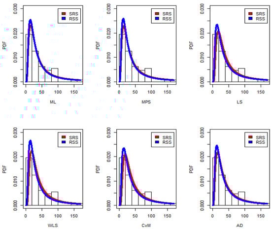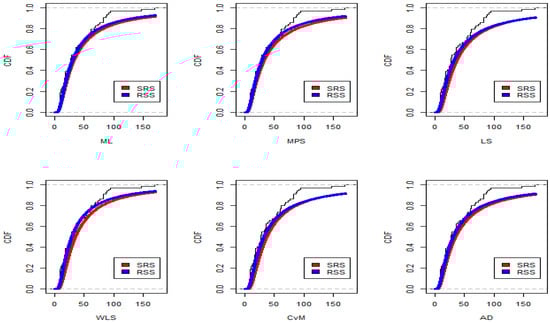 The SRS design is considered for this dataset and for each estimation method, where the estimators are obtained using a sample of size qh = 40. Using the RSS with sample of sizes q = 4 and h = 10 is considered for calculating the estimators. We compare the SRS and RSS designs in terms of the K–S distance value and PVs results given in Table 15, and the corresponding fittings are displayed in Figure 11 and Figure 12. Due to the smallest values of the K–S and the corresponding largest PVs, the RSS is more efficient than the SRS based on the same number of measured units for all estimators.
